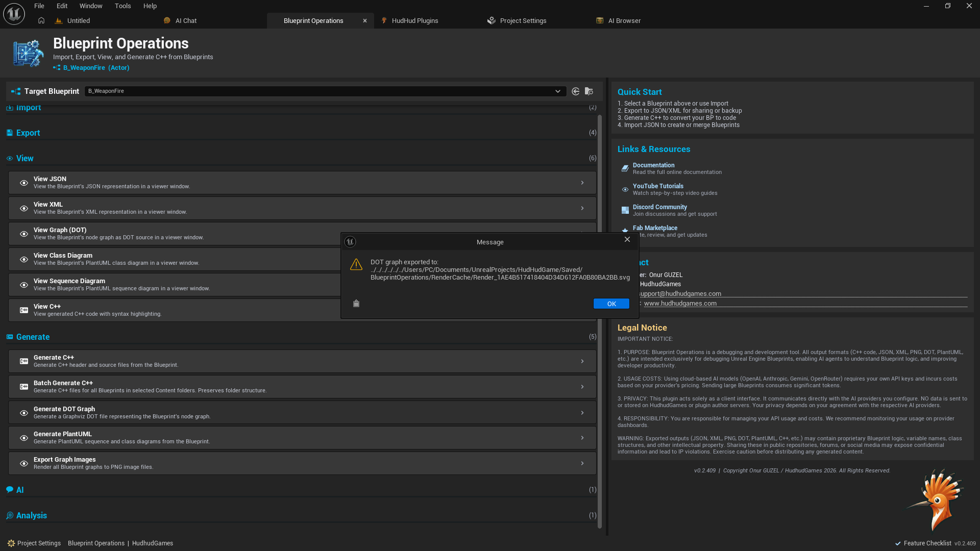 Blueprint Operations is the most comprehensive Blueprint utility toolkit for Unreal Engine. It bridges the gap between visual scripting and text-based workflows by exporting Blueprint graphs to structured JSON, enabling AI-powered analysis, generating placeholder C++ code, and providing a full visual graph inspector — all from the Content Browser context menu or a dedicated editor window.