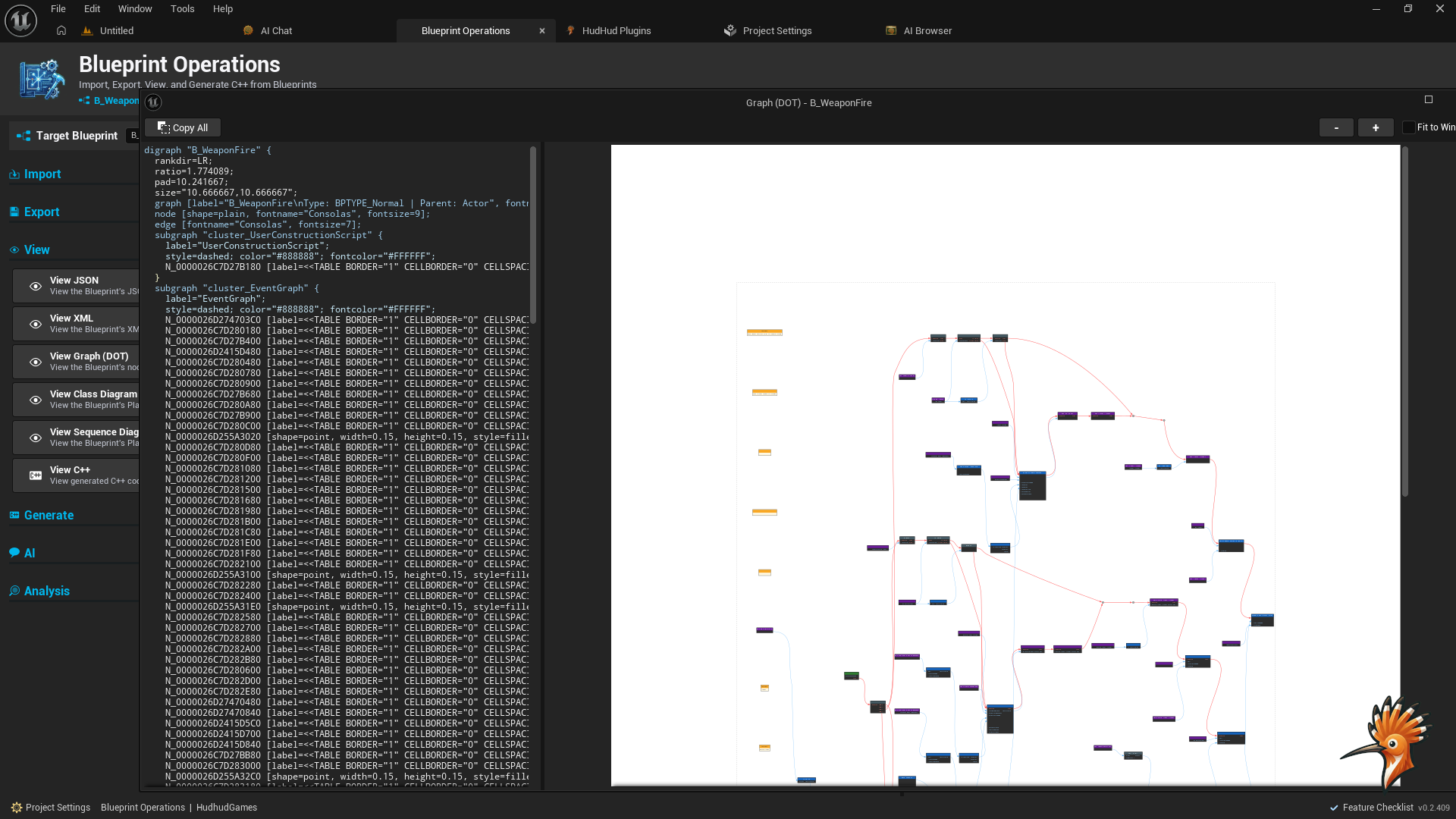 Export Blueprints to JSON, analyze with AI (Ollama/OpenAI/Gemini/DeepSeek/Kimi and many more), generate C skeletons, visual graph inspector. 244 C files. 100% standalone.