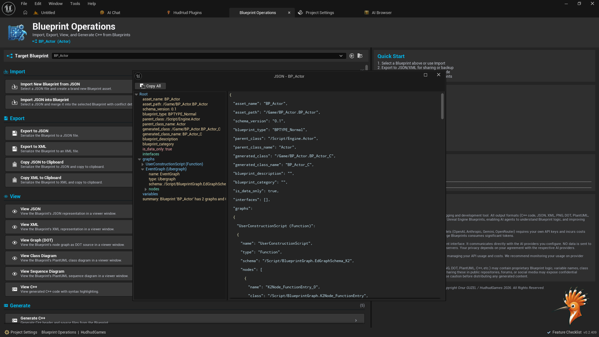 - Send Blueprint JSON directly to AI providers from the Content Browser