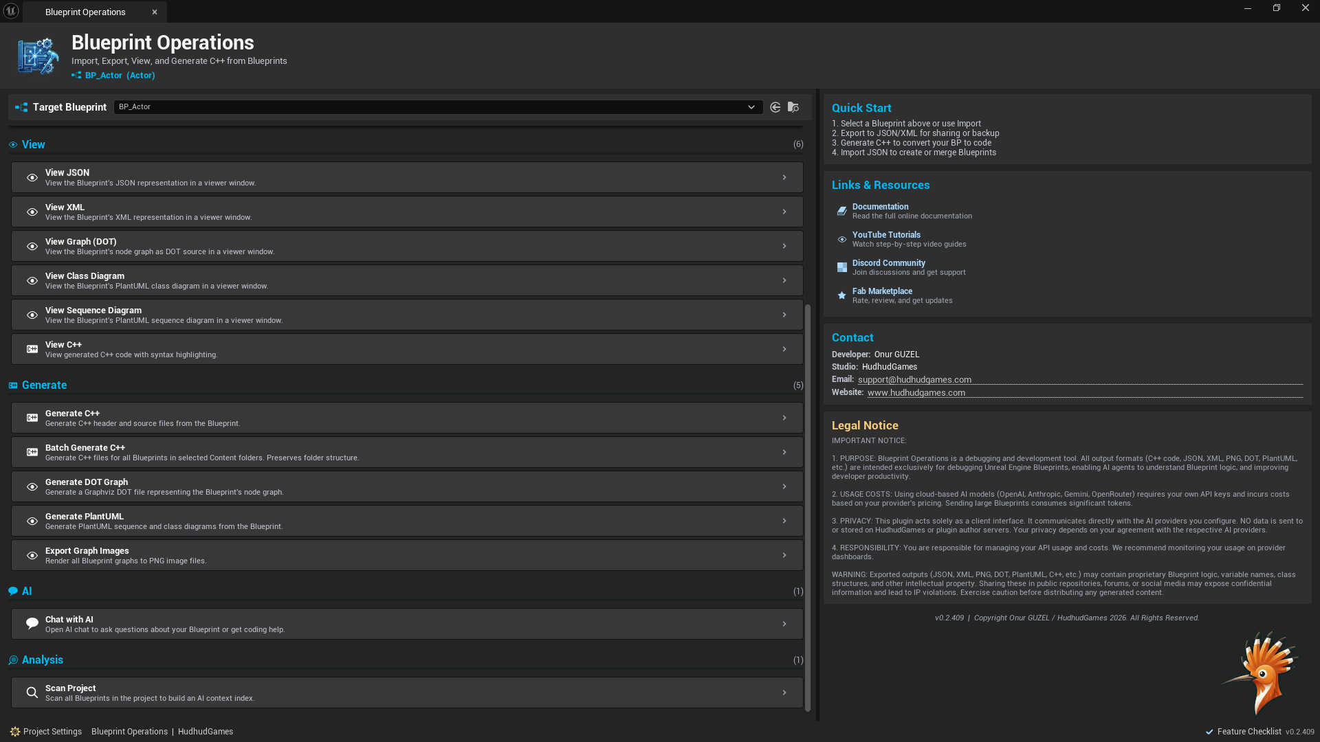 Blueprint Operations is the most comprehensive Blueprint utility toolkit for Unreal Engine. It bridges the gap between visual scripting and text-based workflows by exporting Blueprint graphs to structured JSON, enabling AI-powered analysis, generating placeholder C++ code, and providing a full visual graph inspector — all from the Content Browser context menu or a dedicated editor window.